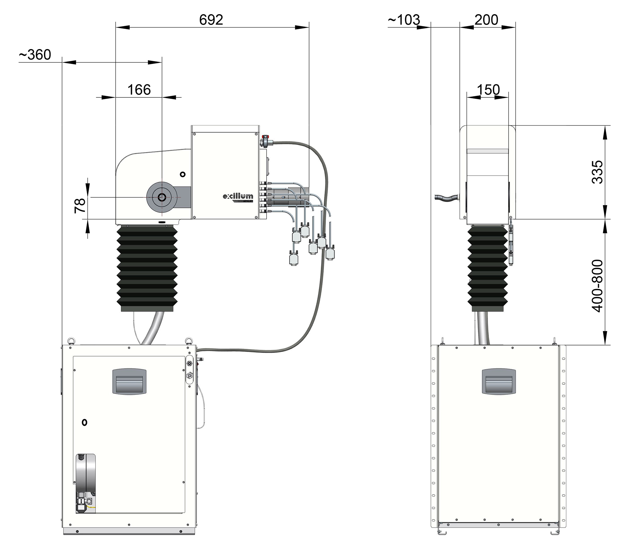 The source consists of the head and the pump system with dimensions shown in the drawing. The head has to be mounted essentially straight above the pump system. The coupling is semi-rigid, allowing some movement of the source head.